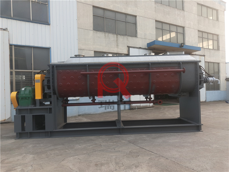 桨叶干燥机由互相啮合的二根桨叶轴、带有夹套的W形壳体、机座以及传动部分组成,物料的整个干燥过程在封闭状态下进行,有机挥发气体及异味气体在密封氛围下送至尾气处理装置,避免环境污染。干燥机以蒸汽(热水或导热油)作为加热介质,轴端装有热介质导入导出的旋转接头。加热介质分为两路,分别进入干燥机壳体夹套和桨叶轴内腔,将器身和桨叶轴同时加热,以传导加热的方式对物料进行加热干燥。被干燥的物料由螺旋送料机定量地连续送入干燥机加料口,物料进入器身后,通过桨叶的转动使物料翻转、搅拌,不断更新加热界面,与器身和桨叶接触,被充分加热,使物料所含的表面水分蒸发。同时,物料随桨叶轴的旋转成螺旋轨迹向出料口方向输送,在输送中继续搅拌,使物料中渗出的水分继续蒸发。最后,产品干燥到指定水分后,物料沿螺旋绞龙进入干燥盘表面,在小干燥盘上的物料通过耙叶的翻抄被移动到外缘,并在外缘落在正下方的大干燥盘外缘,在大干燥盘上的物料向里移动并从中间落料口落入下一层小干燥盘中,大、小干燥盘交替排列,被干燥物料得以连续流经整个干燥有效区。物料受热均匀,无返混、无死角,终水份稳定、一致。确保成品质量。