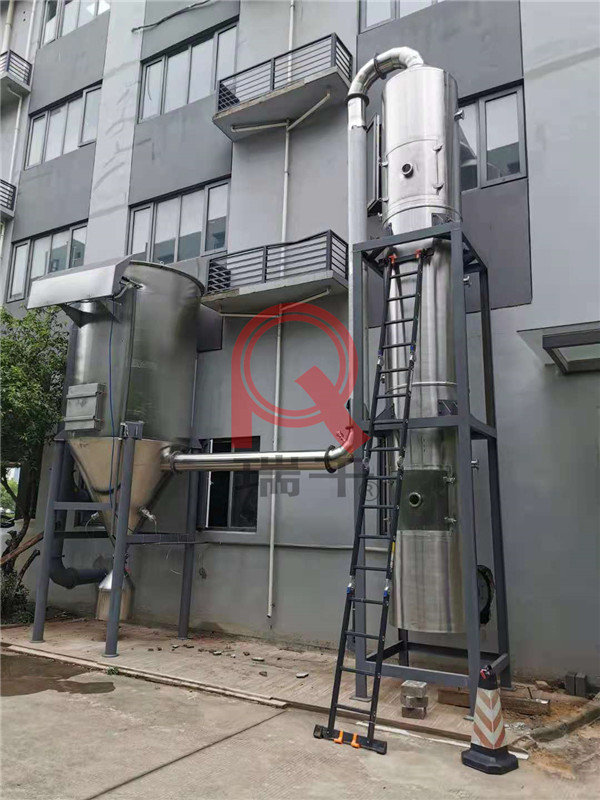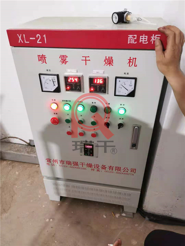 该设备为下喷上并流式喷雾干燥机,工作原理为前端经过闪蒸浓缩系统出的浆液进入喷枪,喷枪内是利用高速气流使液膜产生分裂。高速气流可以用压缩空气。当压缩空气以很高的环西隙速度从雾化器喷出时,因料夜的流速很低,两者之间存在着很高的相对速度。使气液之间摩擦剪切,液体瞬间被拉成细丝状从而产生微小雾滴,从喷嘴口喷射出来,向上喷雾,热风也同时从底部进入干燥室,干燥完成粉体从顶部排出。
