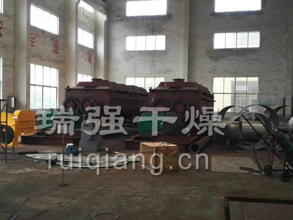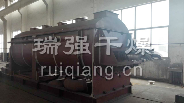 空心轴上密集排列着楔型中空桨叶,热介质经空心轴流经桨叶。单位有效容积内传热面积很大,热介质温度从-40℃到320℃,可以是水蒸汽,也可以是液体型:如热水、导热油等。间接传导加热,没有携带空气带走热量,热量均用来加热物料。热量损失仅为通过器体保温层向环境的散热。楔型 桨叶传热面具有自清洁功能。物料颗粒与楔型面的相对运动产生洗刷作用,能够洗刷掉楔型面上附着物料,使运转中一直保持着清洁的传热面。桨叶干燥机的壳体为W型,壳体内一般安排二到四根空心搅拌轴。壳体有密封端盖与上盖,防止物料粉尘外泄及收集物料溶剂蒸汽。出料口处设置一挡扳,保证料位高度,使传热面被物料覆盖而充分发挥作用。热介质通过旋转接头,流经壳体夹套及空心搅拌轴,空心搅拌轴依据热介质的类型而具有不同的内部结构,以保证^佳的传热效果。