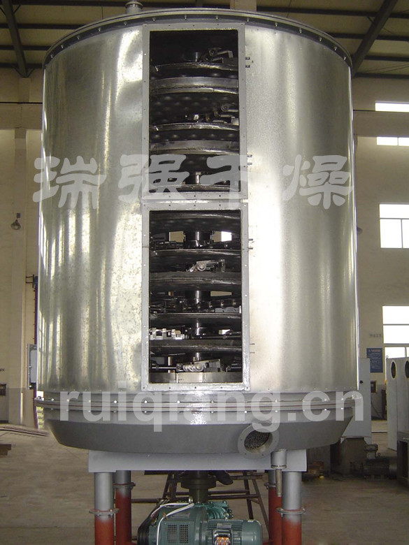 1、物料沿指数螺旋线流化干燥盘表面,在小干燥盘上的物料通过耙叶的翻抄被移动到外缘,并在外缘落在正下方的大干燥盘外缘,在大干燥盘上的物料向里移动并从中间落料口落入下一层小干燥盘中,大、小干燥盘交替排列,被干燥物料得以连续流经整个干燥有效区。物料受热均匀,无返混、无死角,终水份稳定、一致。确保成品质量。