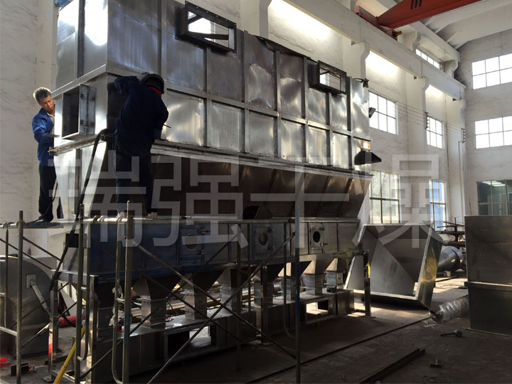 XF系列卧式沸腾干燥机又称流化床或者沸腾床,它是由空气过滤器、沸腾床主机、旋风分离器、布袋除尘器、高压离心通风机、操作台组成。由于干燥物料的性质不同,配套除尘设备时,可按需要考虑,可同时选择旋风分离器、布袋除尘器,也可选择其中一种。一般来说,比重较大的冲剂及颗粒物料干燥只需选择旋风分离器。比重较轻的小颗粒状和粉状物料需配套布袋除尘器,并备有气力送料装置及皮带输机供选择。蒸气、电、热风炉均可配用(按用户要求配套)。散粒状固体物料由加料器加入流化床干燥机中, 洁净的热风经阀板分配进入床体内,从加料器进入的湿物料被热风形成沸腾状态。由于热风与物料广泛接触,增强了传热传质的过程,因此在较短时间内就可干燥。物料从床体的一头进入,经过几十秒至几分钟沸腾干燥后由排料口排出, 气体由沸腾床顶部排出经旋风除尘器组和布袋除尘器回收固体粉料,尾气经由引风机后排空。