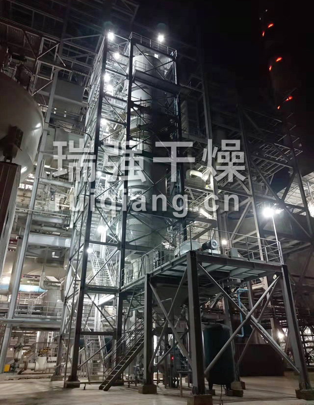 空气经过滤和加热,进入干燥器空气分配器,热风产生的旋转运动经整流装置整流后,形成与塔体轴线平行的直线,料液经喷嘴,形成细微的雾状液珠,与热空气并流接触在极短的时间内可干燥为成品。干燥成品90%由多管除尘器出料,尾气经由引风机进入电除尘器。