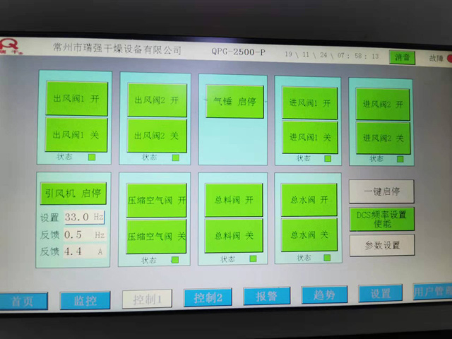 PLC编程控制系统,进风温度,塔内温度,进风压力,塔内压力由传感器在显示屏显示,液体原料由料液泵输送至喷嘴,运行状态由流量计在显示屏显示,进料喷液量与出风温度连锁控制,预留通讯接口与甲方DCS连接。
